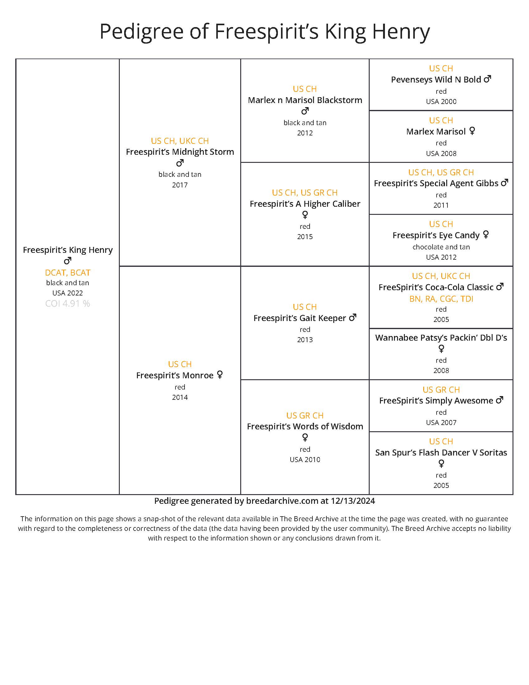 UKC CH FreeSpirit's King Henry, DCAT Born: 7/9/22 Call name: Henry Color: Black & Rust Breeder: Linda Grems